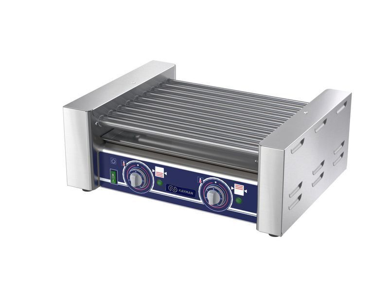 Предназначен для обжаривания и поддержания в горячем состоянии сосисок, сарделек, мясных и рыбных батончиков цилиндрической формы диаметром не менее 18 мм, используемых для приготовления хот-догов в стационарных и мобильных точках общественного питания, в том числе и на АЗС. Все корпусные элементы аппарата, включая ролики, изготовлены из пищевой нержавеющей стали. Принцип действия аппарата заключается в том, что сосиска, расположенная между двумя нагревающимися роликами, поджаривается равномерно со всех сторон благодаря непрерывному вращению роликов. Каждый ролик нагревается изнутри своим ТЭНом, что позволяет обеспечить равномерную температуру по всей длине ролика, а также поддерживать необходимую температуру на поверхности ролика. Гриль имеет две зоны нагрева: 1-я зона – 4 ролика, 2-я зона – 5 роликов. Вращение роликов каждой зоны осуществляются отдельным электродвигателем. Каждый двигатель имеет отдельный выключатель. Ступенчатая регулировка температуры роликов каждой зоны осуществляется отдельным регулятором, расположенным на передней панели гриля. Под роликами установлен съемный поддон для сбора стекающего жира и влаги.