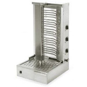 Гриль для шаурмы, производства Roller Grill (Франция) модель GR 60 E, имеет вертикальный вертел-шампур, вращающийся вокруг своей оси, с параллельно расположенными вдоль него нагревательными элементами. В процессе приготовления продукт насаживается на вертел и по мере готовности срезается тонкими кусочками в поддон, откуда берется для начинки. В качестве продуктов для приготовления могут быть использованы различные виды мяса и птицы. Данная модель может вместить до 25 кг мяса за один раз. Главным преимуществом работы на гриле GR 60 E является возможность обжарки большого количества мяса за счет шампура, длинна которого составляет 600 мм. Вертел оборудован автоматическим приводом, гарантирующим равномерную прожарку мяса. Гриль оснащен тремя независимыми нагревательными элементами. Возможность регулирования расстояния между вертелом и нагревательными ТЭНами обеспечивает необходимую прожарку для различных видов продукции, а также позволяет готовить мясо практически любой формы. Корпус гриля для шаурмы изготовлен из нержавеющей стали AISI 304 и соответствует всем стандартам и нормам гигиены профессионального оборудования. Нижняя панель данной модели полностью герметизирована и исключает возможность попадания масла во внутреннюю часть оборудования. Корпус оснащен огнеупорной керамической плитой, которая направляет выделяемое тепло ТЭНов на шампур, а также предотвращает нагрев самой конструкции гриля. Модель GR 60 E устанавливается на 4-х резиновых ножках и имеет следующие габариты (мм): 580 (глубина), 660 (ширина), 870 (высота) и вес 31 кг. Прибор питается от сети с напряжением 380 В частотой 50 Гц и имеет мощность 5,8 кВт. Модель оснащена электромеханической системой управления, которая включает в себя 3 поворотных тумблера и оснащена кнопкой для включения аппарата. Тумблеры могут регулировать нагрев ТЭНов в полную или половинную мощность. Имеется поддон для сбора лишнего жира. Гриль для шаурмы GR 60 E найдет применение в небольших закусочных, снэк-барах и заведениях фаст-фуда.