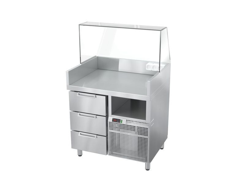 900х750х1425(845*) мм, Подключаемая мощность 4,0 кВт, Мощность холодильного агрегата 0,4 кВт, 220 В, Температура охл. объема +2...+6 °C. Передняя панель оснащена лайт-боксом. * - высота по столешнице Станция дополнительно комплектуется: комби-грилем для сосисок и котлет АРБАТ КГ-7.3-440-01 (или АРБАТ КГ-7.1П-440-01) грилем контактным Маэстро ГК-1/1.55Р (или Маэстро ГК-1/1.55Г)