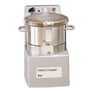 Настольный куттер, производства Robot Coupe (Франция) модель R8, позволяет дробить (орехи, сухари, шоколад и даже замешивать тесто как на пельмени), рубить (мясо) и измельчать продукты ( лук, курага, чернослив, крабовые палочки, кальмары, варёное мясо, сыр, варёные яйца и др.). Стандартная комплектация включает в себя простой нож с двумя лезвиями. Дополнительно куттер можно укомплектовать двумя видами ножей: нож с крупными зубцами для перемалывания и замеса, а также нож с мелкими зубцами для нарезки зелени. Имеет скорость вращения 1500 и 3000 оборотов в минуту, а также режим пульсации, используемый для отслеживания степени измельчения продукта. R8 имеет съемную чашу с двумя ручками из нержавеющей стали объемом 8 литров. Чаша накрывается прозрачной вакуумной крышкой из поликарбоната, которая позволяет следить за процессом. В центре крышки расположено отверстие, которое позволяет добавлять продукты во время цикла обработки. Удобные ручки позволяют с легкостью переносить чашу куттера. Прибор имеет высокую производительность 20-150 порций в час. Модель, выполненная из ABS, имеет современный дизайн и плавные обтекаемые линии, препятствующие скапливанию грязи. Все части прибора, участвующие в рабочем процессе, являются съемными и легко моются. Куттер имеет настольное исполнение и устанавливается на 4-х резиновых ножках. Электронная влагонепроницаемая панель управления включает в себя регулятор скорости, кнопку вкл./выкл., кнопку включения режима пульсации и цифровой таймер с временным диапазоном 0-15 мин. Кнопки управления, выполненные из нержавеющей стали, не выступают над поверхностью корпуса, что способствует простоте очистки панели и повышает ее долговечность. Мощный асинхронный двигатель оснащен системой автоматического торможения при снятии чаши. Прибор имеет степень защиты IP65. Прибор работает от трехфазной сети с напряжением 400 В и частотой 50 Гц. Мощность устройства 2,2 кВт. Габаритные размеры (мм): 315 (ширина), 545 (глубина), 585 (высота). Вес 44,9 кг. Куттер Robot Coupe R8 имеет высокую производительность, современный дизайн, прочную конструкцию и качественные внутренние компоненты. Модель идеально подходит для широкого круга таких заведений общественного питания как кафе, бары, рестораны, заведения фаст-фуд и уличной торговли.