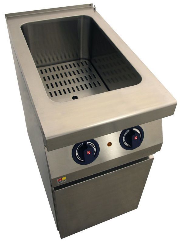 Электрическая макароноварка с регулируемым термостатом 700-й серии, производства KOVINASTROJ (Словения) модель EKT-T47/V-Т, предназначена для отваривания широкого ассортимента изделий из теста. Для отваривания продуктов варочный аппарат имеет одну ванну, изготовленную из высоколегированной стали AISI316TI и имеющую высокую стойкость к коррозии – поверхность ванны постоянно подвержена воздействию воды и соли. Варочные емкости имеют высокую прочность идолговечность, а благодаря скругленным углам их легко чистить. Ванна имеет специальную изоляцию, которая минимизирует потери тепла во время работы. Емкость рассчитана на использование 3 корзин формата GN 1/3 с размерами (мм): 290 (ширина), 160 (глубина), 200 (высота) или 6 корзин формата GN 1/6 с размерами (мм): 140 (ширина), 140 (глубина), 200 (высота). Высокопроизводительные нагревательные элементы расположены внутри ванны, тем самым способствуя более быстрому нагреву воды. Мощность данной модели составляет 4,5 кВт. Непосредственно под самой макароноваркой расположен закрытый шкаф для хранения подготовленных к варке продуктов, оборудованный одной дверкой и магнитным замком для более плотного закрытия. Вода в ванну подается с помощью крана, подключаемого к водопроводу. Корпус макароноварки изготовлен из нержавеющей стали AISI 304 и соответствует всем стандартам и нормам гигиены профессионального кухонного оборудования. Несмотря на довольно компактные габариты (мм): 400 (ширина), 700 (глубина), 900 (высота) и вес - 35 кг, аппарат имеет хорошую производительность. Нагрев ванны осуществляется с помощью электрической сети с напряжением 400 В и частотой 50 Гц. Аппарат оснащен интуитивно понятной электромеханической панелью управления, на которой расположены: два поворотных тумблера (терморегулятор и таймер), два световых индикатора, а также кран для слива отработанной воды из ванны. Для исключения перегрева в панель управления вмонтирован автоматический ограничитель температуры. Кроме того, макароноварка оснащена специальным термостатом, который не допустит нагрева ванны в том случае, если в ней нет воды. Варочный аппарат EKT-T47/V-Т имеет напольное исполнение и монтируется на 4 ножках из нержавеющей стали, с возможностью регулировки по высоте для установки оборудования на неровные поверхности. Данная модель является достаточно простой в эксплуатации и идеально подойдет для использования как в ресторанах или кафе, так и в фаст-фуд заведениях.