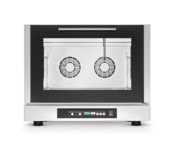 Конвекционная электрическая печь Tecnoeka EKF 416 D UD является настольной моделью для небольших предприятий общепита и пищевого производства. Она дает возможность выпекать кондитерские и хлебобулочные изделия с румяной корочкой, подогревать готовые и замороженные блюда, готовить пищу по другим технологиям. Внешний вид и конструкция Корпус печи обладает прямоугольной формой и компактными габаритами. Его обшивка и внутренняя рабочая камера изготовлены из нержавеющей стали. Камера имеет закругленные углы, 4 пары направляющих для размещения гастроемкостей GN 1/1 или противней 600*400 мм. В ней установлены нагревательные элементы, вентиляторы для конвекции, инжектор для парообразования. Камера закрывается откидной дверцей с эргономичной ручкой и окном из двухслойного термостойкого стекла. На корпусе под дверцей расположена электронная панель управления с сенсорным экраном. Особенности Подключение к водопроводу. Прямой впрыск для парообразования. Универсальные направляющие. Подсветка камеры. 99 ячеек памяти для запоминания рецептов. Готовка в 4 этапа с отдельной установкой параметров.