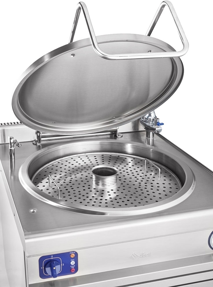 Напольный электрический пищеварочный котёл ABAT КПЭМ-60/9Т 900-й серии предназначен для кипячения воды, приготовления бульонов, супов, компотов и других блюд на предприятиях общественного питания и пищевой промышленности малого формата. Нагрев воды производится способом "пароводяной рубашки". Оснащён сливным краном и крышкой, которая может быть зафиксирована в любом положении. Имеет регулируемые по высоте ножки. На выбор предлагается два варианта: у первой модификации корпус выполнен полностью из нержавеющей стали, у второй лицевые панели изготовлены из нержавеющей стали, а боковые и задняя – из оцинкованной стали с полимерным покрытием. Сосуд обеих модификаций выполнен из нержавеющей стали. Оборудование может использоваться как отдельно (в том числе, установленное пристенно), так и в составе технологических линий. Не предназначен для приготовления повидла, джема и мусса. Ключевые особенности: 3 режима нагрева - слабый, средний и сильный Автоматическое отключение нагрева при отсутствии воды Цельнотянутый варочный сосуд (без сварных швов) Дополнительные опции (необходимо заказывать отдельно): Пароварочный комплект КП-60 Варочный сосуд из кислотостойкой нержавеющей стали AISI 316