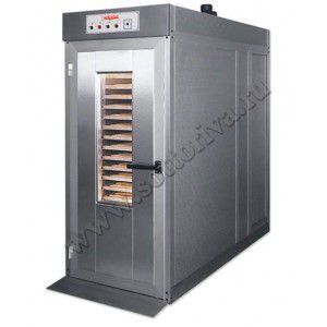 Шкаф окончательной расстойки, производства фирмы Sottoriva (Италия) модель CLQ 40X60, с двумя дверями и четырьмя тележками, предназначен для выдержки тестовых заготовок хлебобулочных и кондитерских изделий (круассанов, рогаликов, бубликов, булочек, пирожных) перед приготовлением при повышенной температуре и высокой влажности, давая возможность окончательно подготовить тесто к выпечке. Расстойка происходит при температуре от 35 до 45 °C и относительной влажности 75-85 %. Повышенная температура воздуха ускоряет брожение в тестовых заготовках, а достаточно высокая влажность предотвращает образование на поверхности изделий подсохшей корочки. Продолжительность расстойки зависит от массы заготовок, рецептуры теста, свойств муки и ряда других немаловажных факторов. Модель расстоечного шкафа CLQ 40X60 является полностью автономной системой, что дает возможность установить аппарат в любой точке помещения. Отличительной чертой данной модели является встроенный парогенератор (с ручным или автоматическим управлением) для постоянного поддержания нужной влажности внутри аппарата. Также камера оснащена автоматическим терморегулятором и устройством повторной циркуляции воздуха с возможностью регулировки воздушного потока. Аппарат вмещает в себя 24 противня размером 400 мм (ширина), 600 мм (глубина) каждый. В конце расстойки тестовые заготовки значительно увеличиваются в объеме (на 50—70 % от исходного). Поверхность тестовых заготовок становится гладкой и эластичной, за счет чего готовое изделие из такого теста не имеет разрывов и трещин. Корпус расстоечного шкафа выполнен из нержавеющей стали AISI 304 и соответствует всем стандартам и нормам гигиены профессионального оборудования. Полки шкафа легко снимаются и моются. Модель CLQ 40X60 имеет внутреннюю подсветку, которая позволяет следить за приготовлением продукта. Шкаф также имеет специальный металлический пол. Данная модель имеет следующие габаритные размеры (мм): 1500 (ширина). 1650 (глубина), 2000 (высота). Прибор питается от сети с напряжением 380 В и частотой 50 Гц. Аппарат имеет мощность 5 кВт (теплогенератор – 3 кВт, парогенератор – 2 кВт). Расстоечный шкаф CLQ 40X60 оснащен электромеханической системой управления, которая включает в себя поворотные тумблеры для управления температурой и влажностью. Расстоечный шкаф CLQ 40X60 совмещает в себе простоту в эксплуатации и быстродействие. Он предназначен для использования в кондидерских цехах и пакернях, а также подойдет для кухонь с собственной выпечкой.