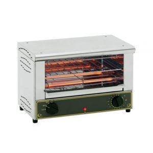 Электрический настольный тостер, производства ROLLER GRILL (Франция) модель BAR 2000, предназначен для разогрева и поджаривания готовых к употреблению кулинарных изделий – булочек, бутербродов, рулетов, закрытых сэндвичей, сосисок, пицц. Данная модель имеет два уровня загрузки и горизонтальный тип запекания. В комплекте с тостером идет две гриль решетки и специальные щипцы, с помощью которых можно переворачивать и доставать горячую пищу. Внутренняя камера оснащена инфракрасными кварцевыми трубками, с помощью которых происходит нагрев в тостере. Производительность данной модели составляет 300 тостов/час. Рабочая поверхность имеет следующие размеры (мм): 350 (ширина), 240 (глубина). Корпус тостера изготовлен из нержавеющей стали AISI 304. Данная модель имеет следующие габариты (мм): 450 (ширина), 285 (глубина), 420 (высота), а вес составляет 12 кг. Электрический тостер имеет общую мощность 3,2 кВт и работает от сети с напряжением 220В и частотой 50Гц. Аппарат оснащен электромеханической панелью управления, на которой расположены поворотный тумблер для регулирования температуры нагрева рабочей поверхности и таймер на 15 мин. Также имеется световой индикатор, отображающий состояние (вкл / выкл) оборудования. Данная модель устанавливается на четырех резиновых ножках. Электрический настольный тостер ROLLER GRILL BAR 2000 отлично подойдет небольшим закусочным, заведениям фаст-фуда и даже найдет применение в домашних условиях.
